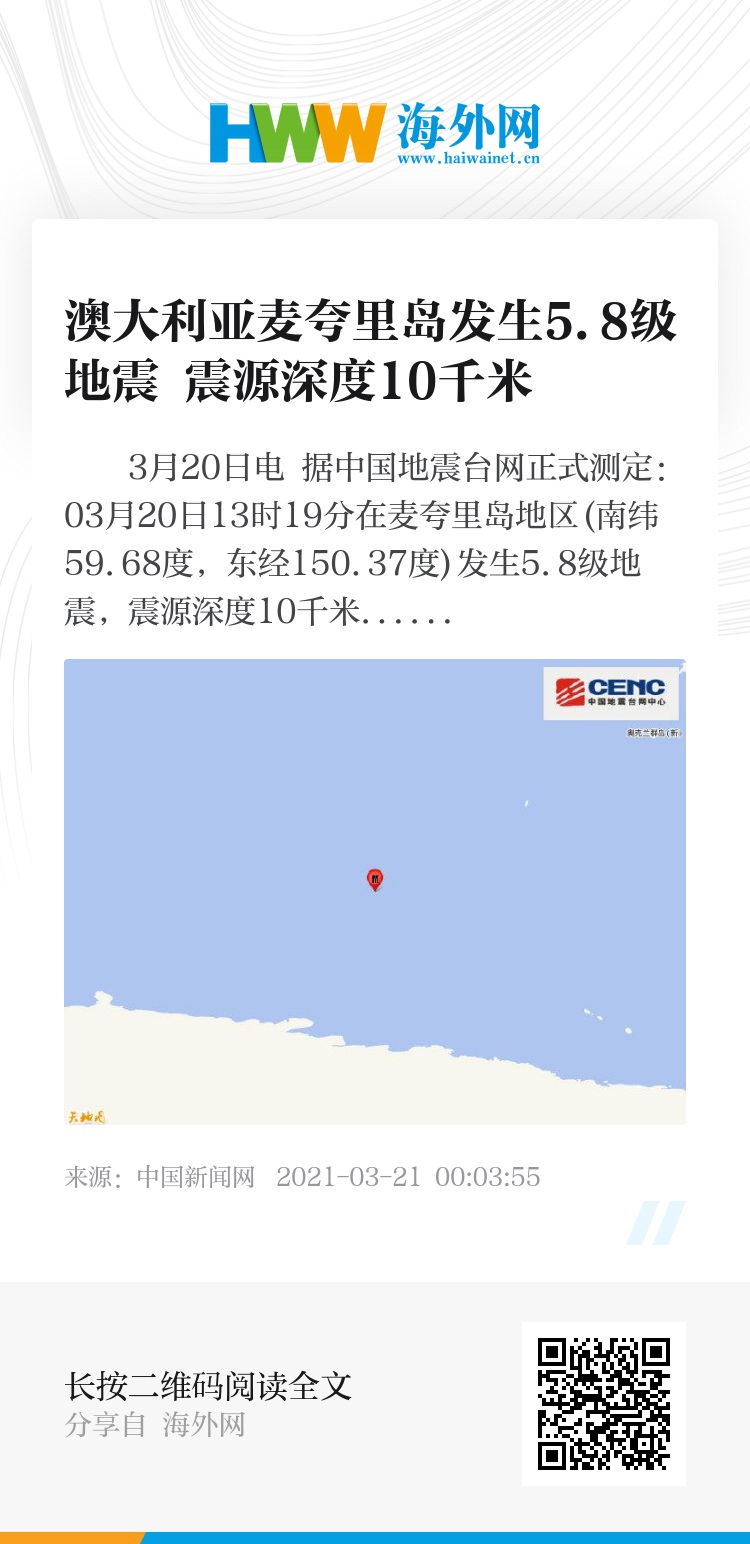 中新网3月20日电 据中国地震台网正式测定:03月20日13时19分在麦夸里岛地区(南纬59.68度,东经150.37度)发生5.8级地震,震源深度10千米。