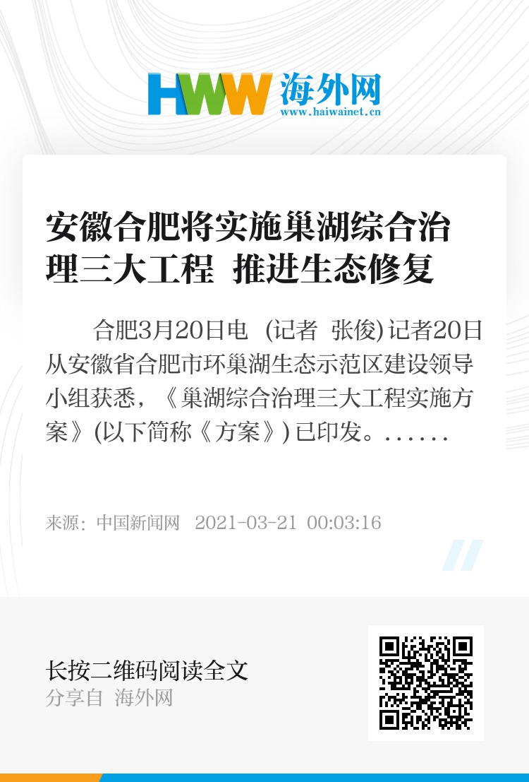 中新网合肥3月20日电 (记者 张俊)记者20日从安徽省合肥市环巢湖生态示范区建设领导小组获悉,《巢湖综合治理三大工程实施方案》(以下简称《方案》)已印发。“十四五”期间,合肥将通过实施碧水、安澜、富民三大工程,稳步提升巢湖水质。2021年,合肥将实施巢湖综合治理项目136个,计划完成总投资88.1亿元人民币。