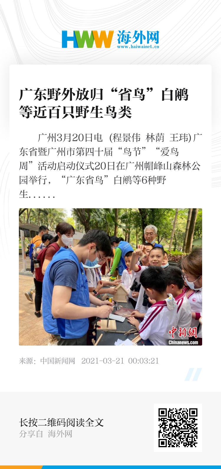 中新网广州3月20日电 (程景伟 林荫 王玮)广东省暨广州市第四十届“鸟节”“爱鸟周”活动启动仪式20日在广州帽峰山森林公园举行,“广东省鸟”白鹇等6种野生鸟类(共近100只)现场被放飞回归大自然。