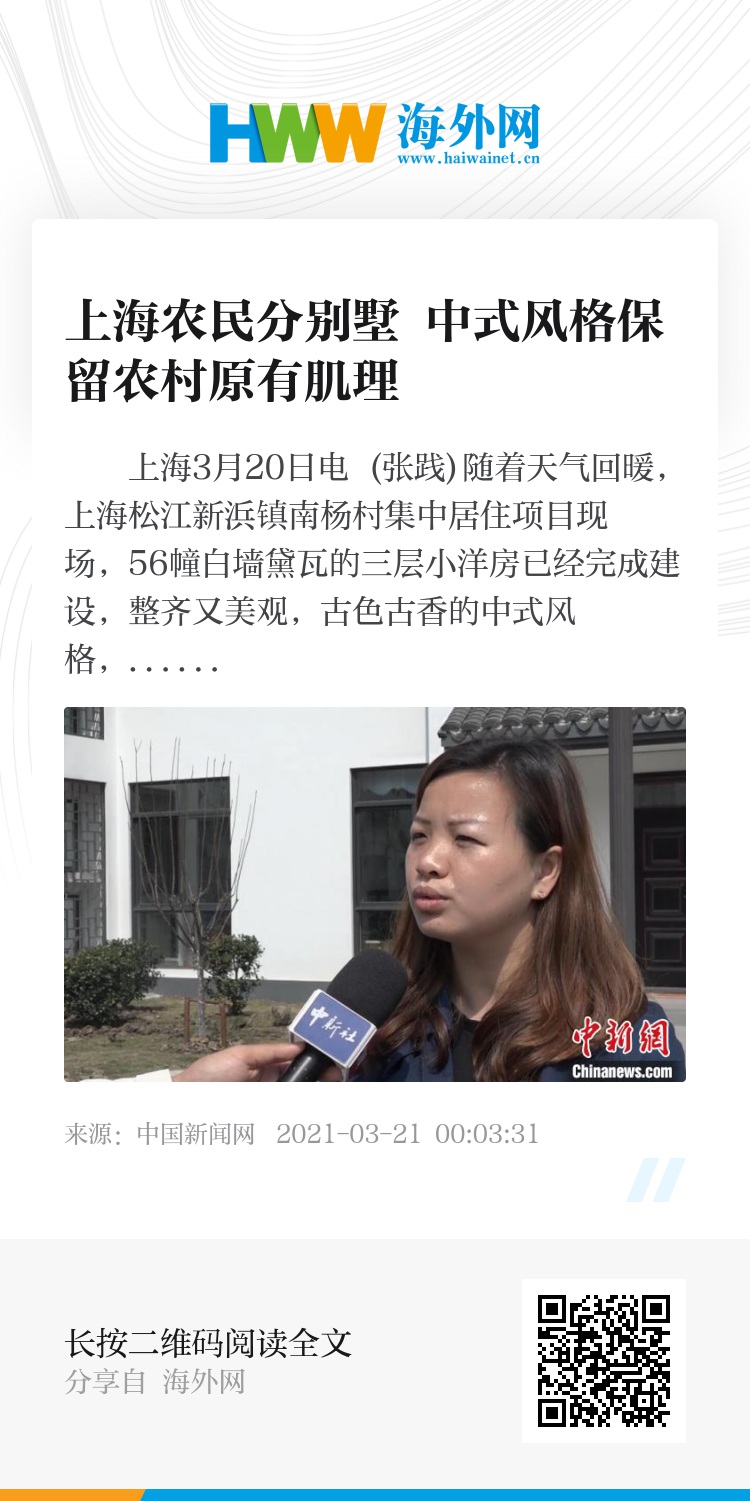 中新网上海3月20日电 (张践)随着天气回暖,上海松江新浜镇南杨村集中居住项目现场,56幢白墙黛瓦的三层小洋房已经完成建设,整齐又美观,古色古香的中式风格,保留了农村的原有肌理,也还原江南水乡的面貌。