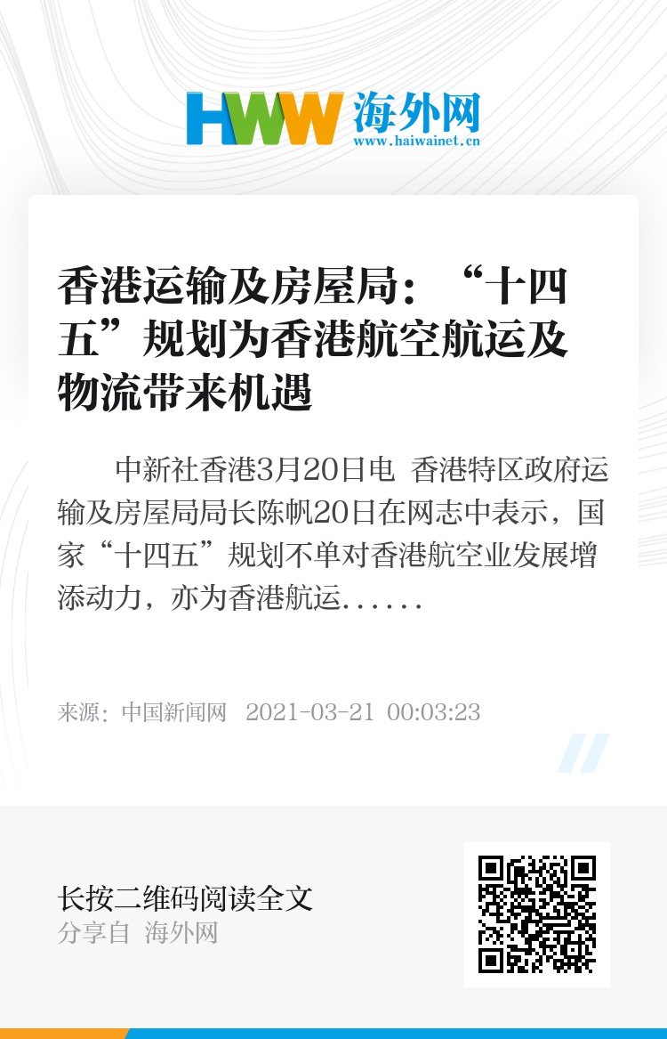 中新社香港3月20日电 香港特区政府运输及房屋局局长陈帆20日在网志中表示,国家“十四五”规划不单对香港航空业发展增添动力,亦为香港航运及物流业发展带来机遇。