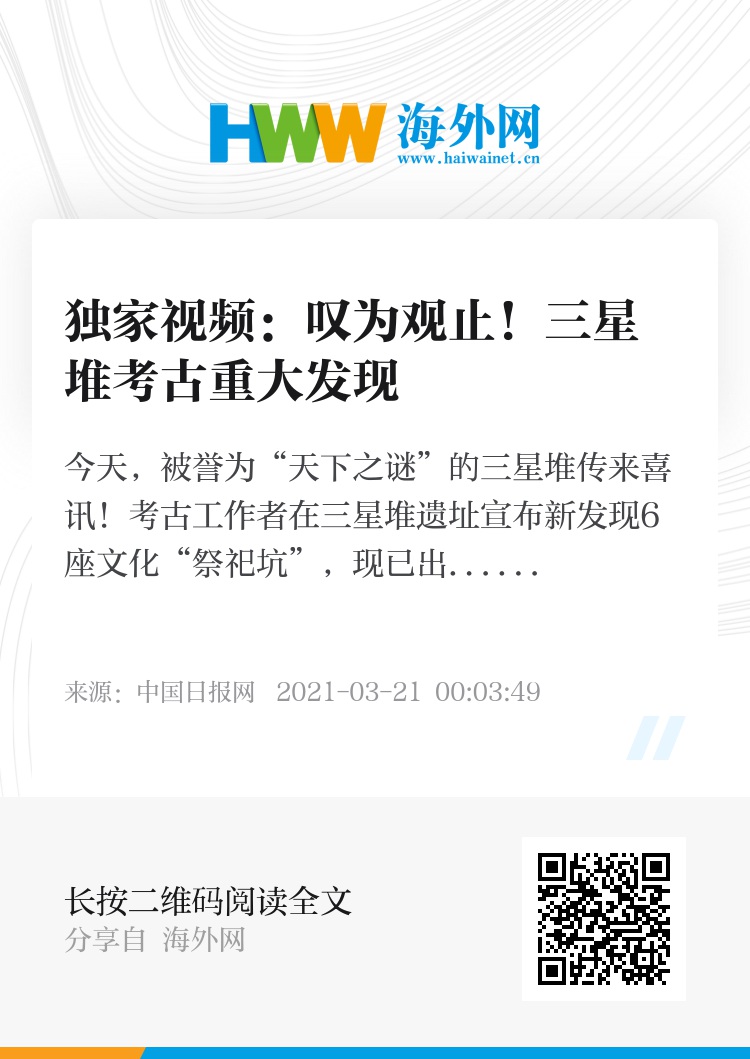 今天,被誉为“天下之谜”的三星堆传来喜讯!考古工作者在三星堆遗址宣布新发现6座文化“祭祀坑”,现已出土金面具残片、巨青铜面具、青铜神树、象牙等重要文物500余件,叹为观止哦!精彩视频看起来!(记者:王恺昊 剪辑:赵思远)