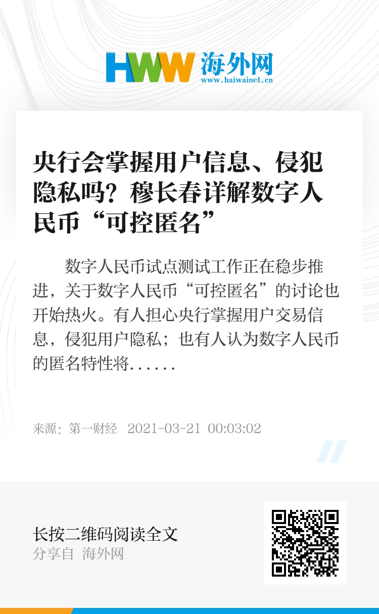 “这其实是误解,尽管电信运营商的支付部门也参与了数字人民币研发,但现行国家有关法律规定,电信运营商不得将手机客户信息披露给央行等第三方,当然也不得向自己运营数字人民币的部门提供。”3月20日,在中国发展高层论坛2021年会上,中国人民银行数字货币研究所所长穆长春回应称,用手机号开立的数字人民币钱包对于人民银行和各运营机构来说是完全匿名的。