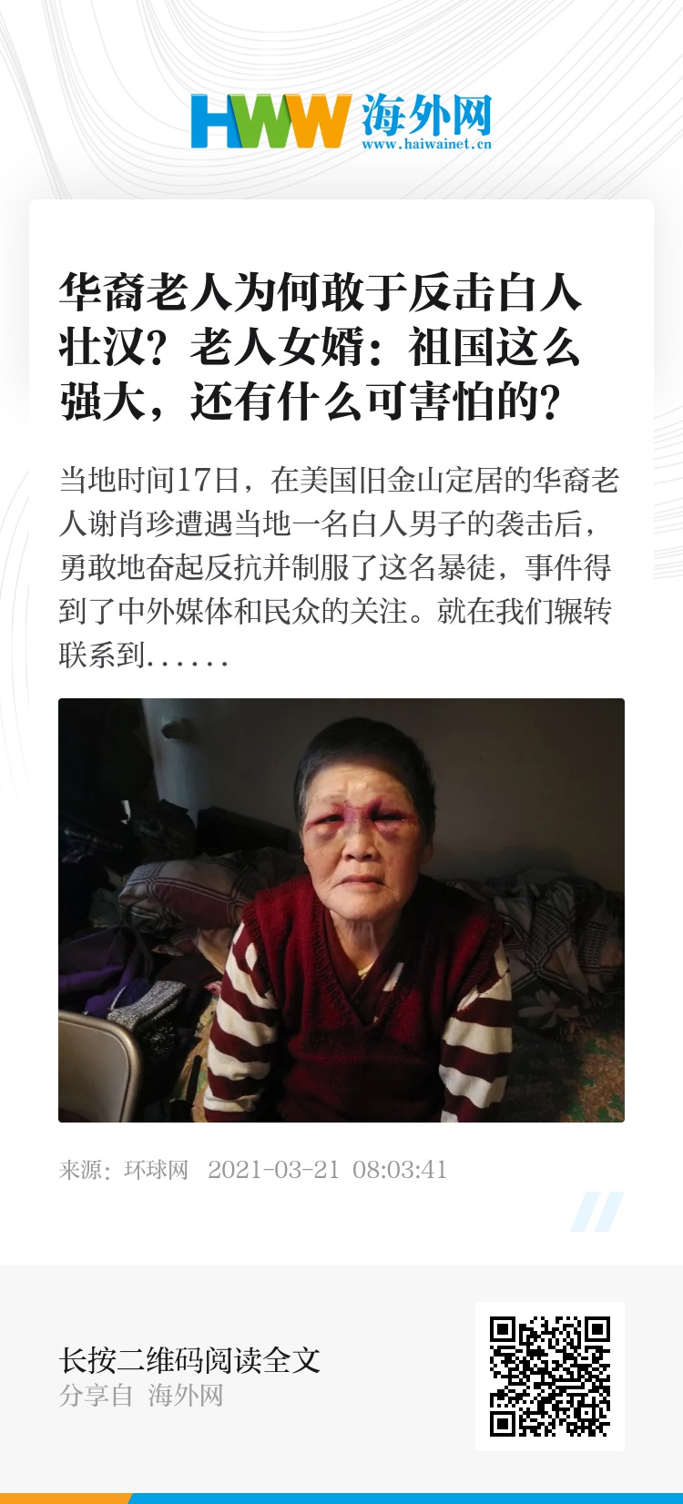 当地时间17日,在美国旧金山定居的华裔老人谢肖珍遭遇当地一名白人男子的袭击后,勇敢地奋起反抗并制服了这名暴徒,事件得到了中外媒体和民众的关注。
