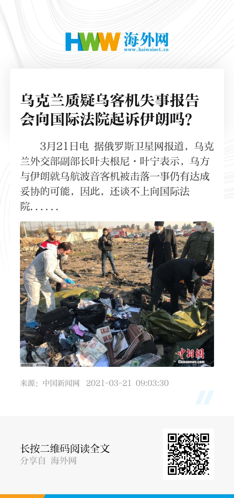 据报道,伊朗塔斯尼姆通讯社3月17日发布了伊朗民航组织有关调查2020年一架乌克兰飞机在德黑兰附近失事的最终报告。乌克兰外长库列巴称,伊朗关于2020年在德黑兰附近乌克兰波音飞机失事的报告“偏颇”,并称基辅与国际伙伴一道不允许该国逃避对该罪行的责任。