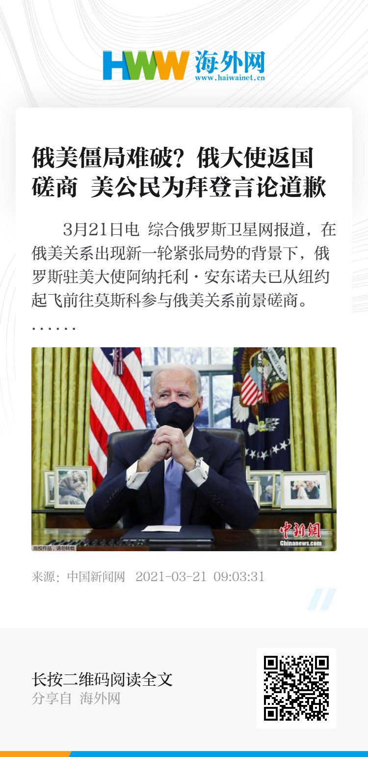 中新网3月21日电 综合俄罗斯卫星网报道,在俄美关系出现新一轮紧张局势的背景下,俄罗斯驻美大使阿纳托利·安东诺夫已从纽约起飞前往莫斯科参与俄美关系前景磋商。安东诺夫表示,俄使馆收到了一些美国公民的来信,对美国当局针对俄罗斯的言论作出道歉,这表明两国关系正常化的潜力依在。