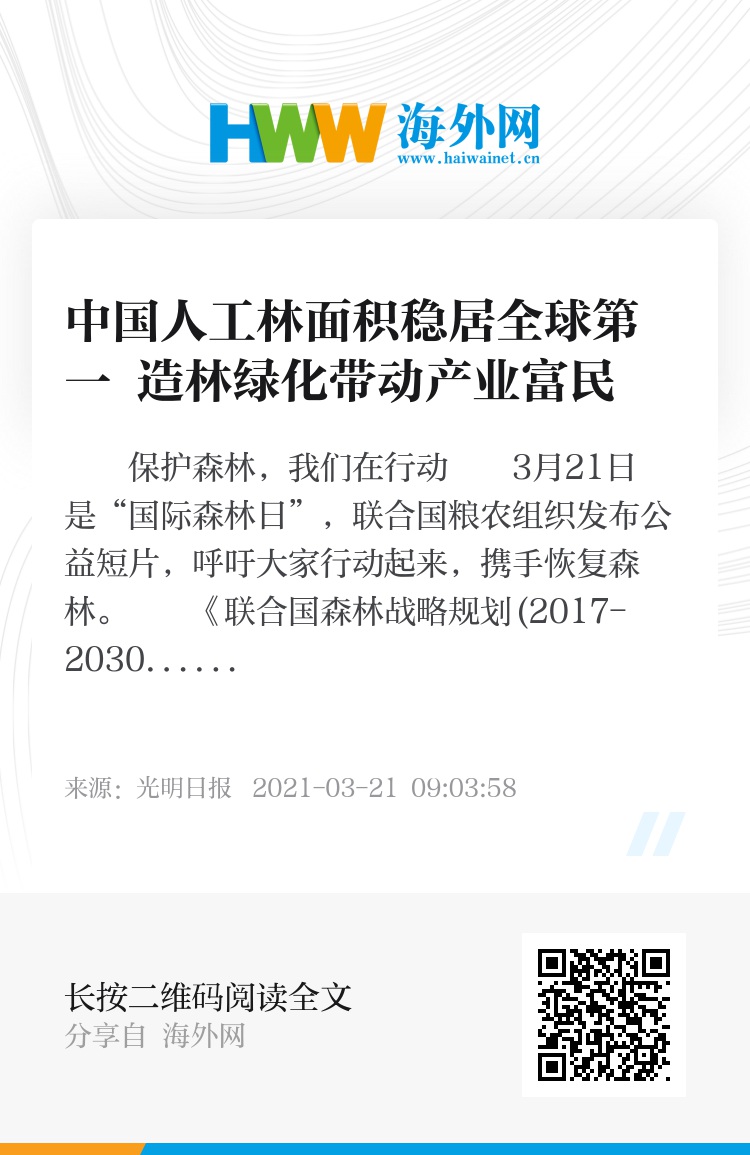 近年来,中国创新推动森林可持续经营,积极参与全球森林治理,得到了国际社会的高度评价,为实现全球森林目标贡献了中国智慧和力量。