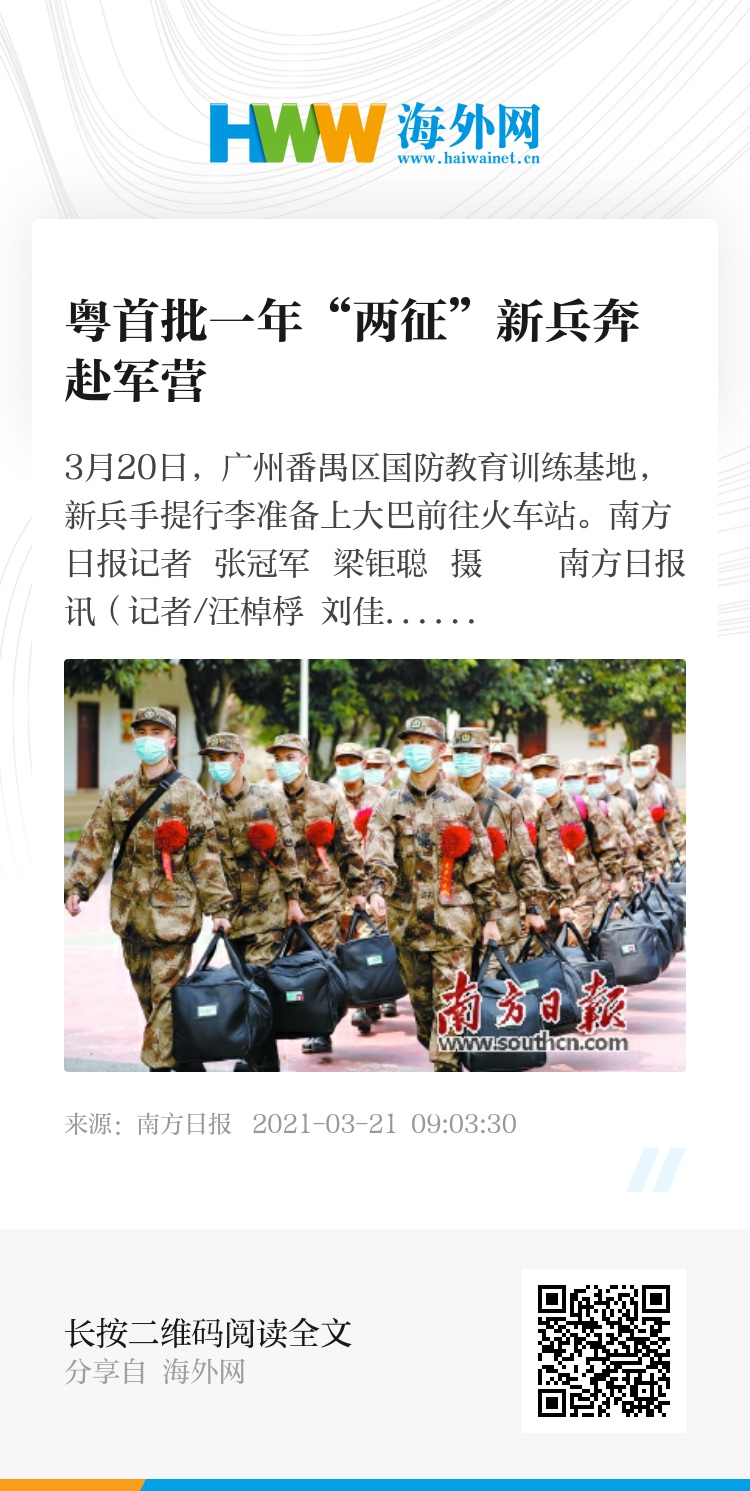 近日,广东2021年春季征兵进入新兵起运阶段,这些“准新兵”们即将启程奔赴全国各地。这也是实施一年“两征”后,广东首批春季起运的新兵。去年,经国务院、中央军委批准,将义务兵征集由一年一次征兵一次退役,调整为一年两次征兵两次退役。通过增加征集次数、减少单次入伍新兵数量,保持兵员平稳进出,并进一步提升兵员征集质量和新兵训练质量。