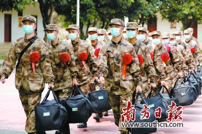 南方日报讯(记者/汪棹桴 刘佳荣)3月20日下午,广州火车站东广场前,站满了身着迷彩服、胸戴“光荣花”的身影,他们都是来自全省各地的新兵,即将登上前往军营的列车。