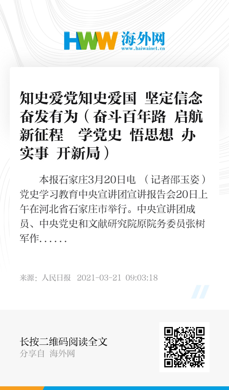 本报石家庄3月20日电 (记者邵玉姿)党史学习教育中央宣讲团宣讲报告会20日上午在河北省石家庄市举行。中央宣讲团成员、中央党史和文献研究院原院务委员张树军作宣讲报告。