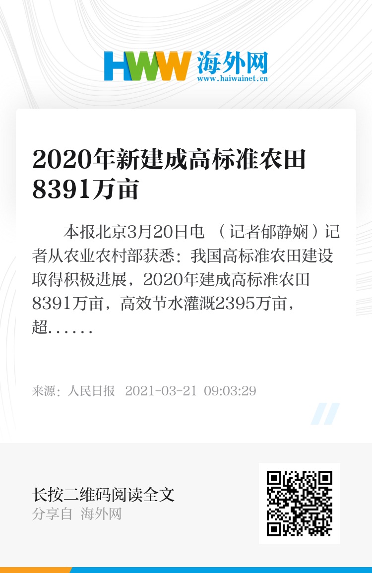 本报北京3月20日电 (记者郁静娴)记者从农业农村部获悉:我国高标准农田建设取得积极进展,2020年建成高标准农田8391万亩,高效节水灌溉2395万亩,超额完成年度目标,进一步提升我国粮食保障能力。