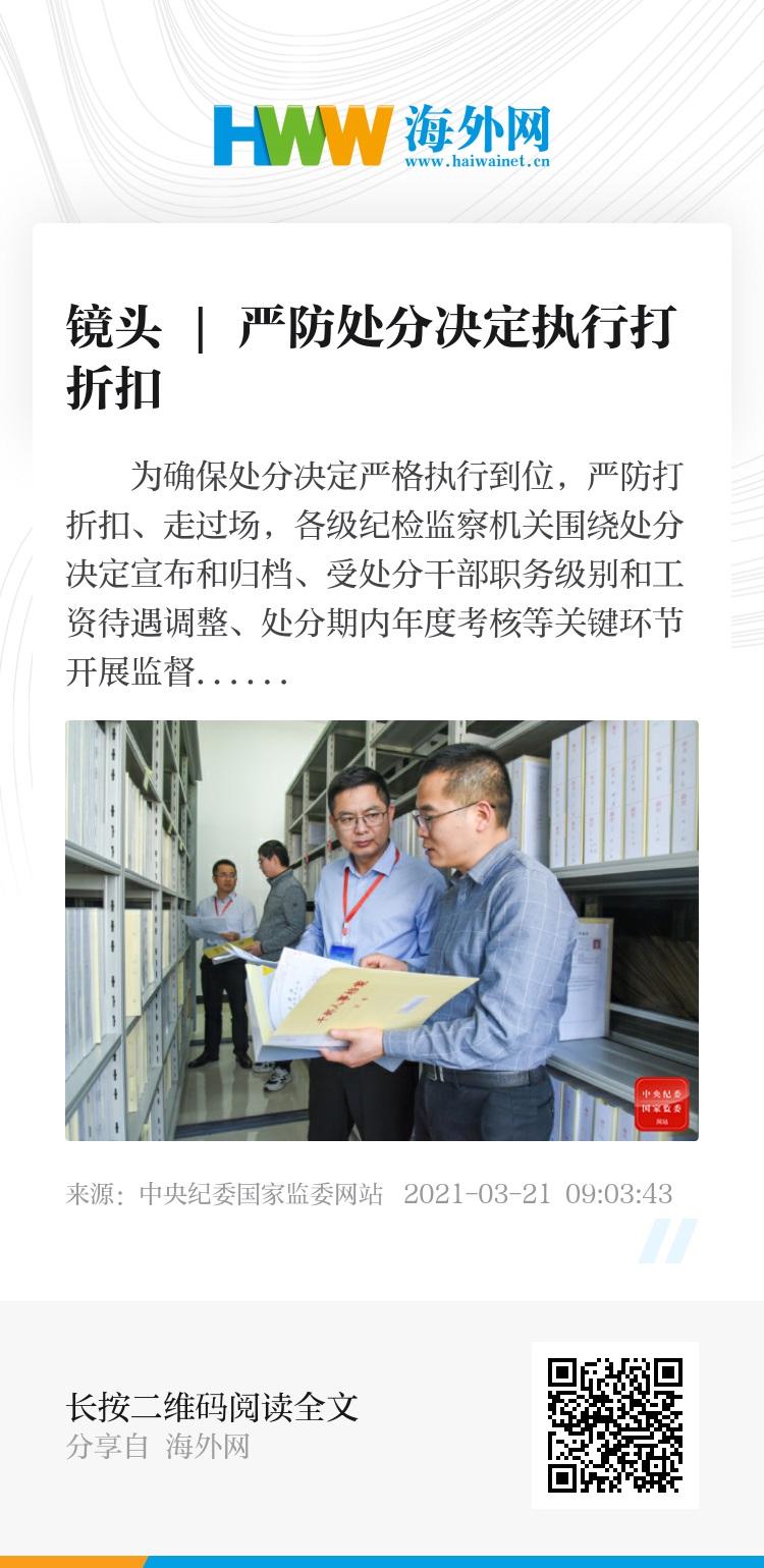 为确保处分决定严格执行到位,严防打折扣、走过场,各级纪检监察机关围绕处分决定宣布和归档、受处分干部职务级别和工资待遇调整、处分期内年度考核等关键环节开展监督检查,核查落实情况。