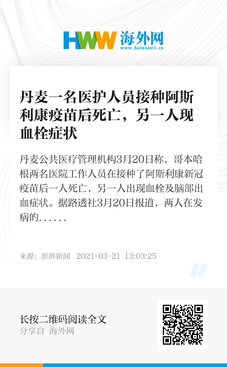 丹麦公共医疗管理机构3月20日称,哥本哈根两名医院工作人员在接种了阿斯利康新冠疫苗后一人死亡,另一人出现血栓及脑部出血症状。