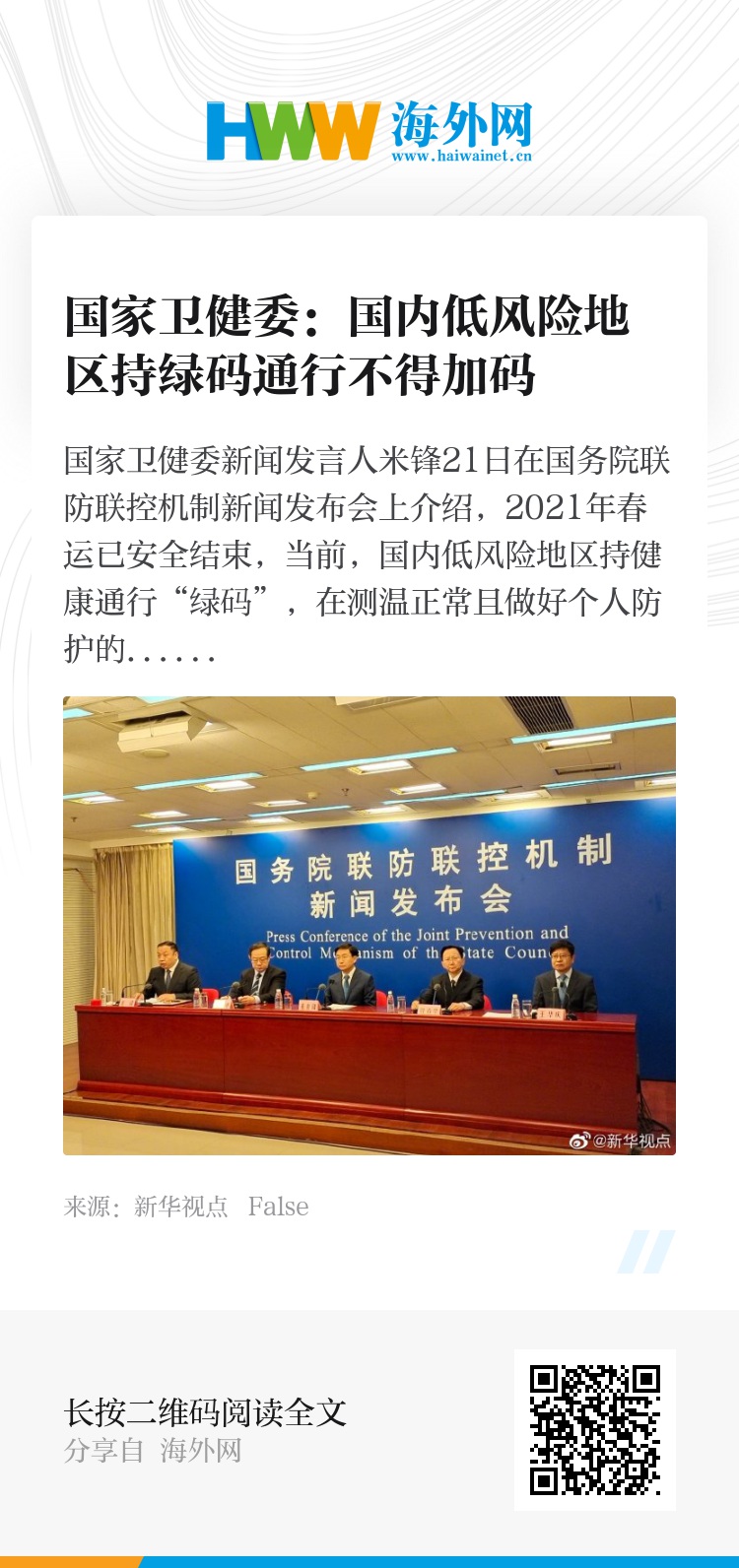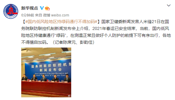 国家卫健委新闻发言人米锋21日在国务院联防联控机制新闻发布会上介绍,2021年春运已安全结束,当前,国内低风险地区持健康通行“绿码”,在测温正常且做好个人防护的前提下可有序出行,各地不得擅自加码。(记者陈席元、彭韵佳)