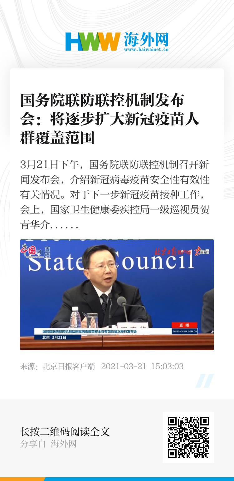 3月21日下午,国务院联防联控机制召开新闻发布会,介绍新冠病毒疫苗安全性有效性有关情况。对于下一步新冠疫苗接种工作,会上,国家卫生健康委疾控局一级巡视员贺青华介绍,会继续按照区分轻重缓急、坚持知情、同意、自愿、免费接种,常态化防控与接种工作相统筹,依法审慎稳妥有序落实地方属地责任和行业监管责任,更加安全、有序、有力地推进疫苗接种,逐步扩大人群的覆盖范围,尽可能让更多群众接种疫苗,保护好广大人民群众的身体健康。