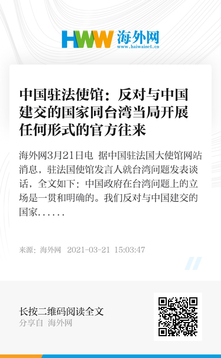 海外网3月21日电 据中国驻法国大使馆网站消息,驻法国使馆发言人就台湾问题发表谈话,全文如下:
