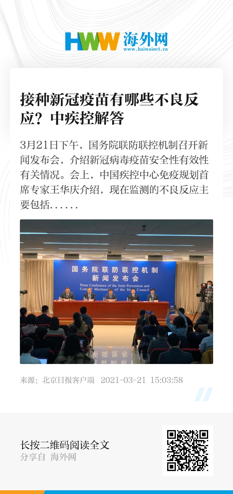 3月21日下午,国务院联防联控机制召开新闻发布会,介绍新冠病毒疫苗安全性有效性有关情况。会上,中国疾控中心免疫规划首席专家王华庆介绍,现在监测的不良反应主要包括局部的反应和全身的反应。其中,局部的反应,是接种之后会出现疼痛的情况,有的会出现红肿,有的会出现硬结,这些局部的反应都不需要处理,会自行痊愈;全身反应表现相对多的,一个是头痛、乏力,有的还会出现低热的情况。