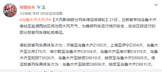据“新疆发布”微博消息,21日,兰新客专线乌鲁木齐南站至盐湖西站区间出现大风天气,为确保列车运行绝对安全,在该区段运行的部分旅客列车停轮或停运。