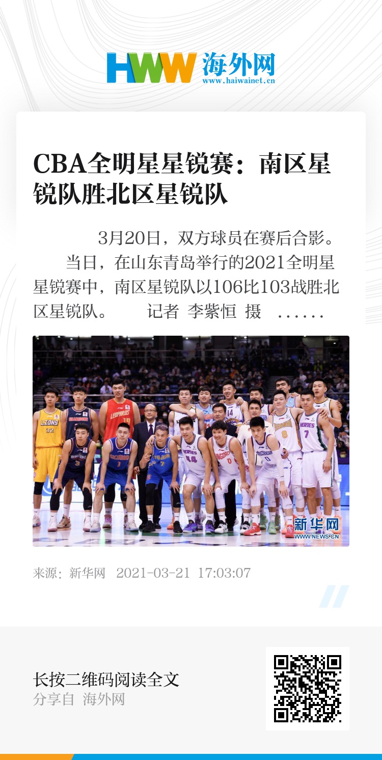 当日,在山东青岛举行的2021全明星星锐赛中,南区星锐队以106比103战胜北区星锐队。