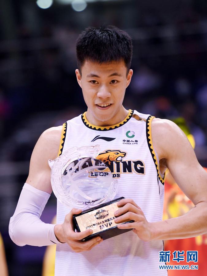 3月20日,北区星锐队球员张镇麟举起最有价值球员(MVP)奖杯。