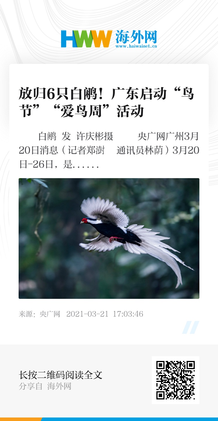 央广网广州3月20日消息(记者郑澍 通讯员林荫)3月20日-26日,是广东省第四十届“爱鸟周”,今年的主题是“保护野生鸟类 推动绿色发展”。为进一步增强公众野生动植物保护意识,3月20日上午,广东省暨广州市第四十届“鸟节”“爱鸟周”活动在广东省帽峰山森林公园举行启动仪式,组织开展野外放归活动,包括6只广东省鸟白鹇在内的6种鸟类共近百只被放飞,回归大自然。