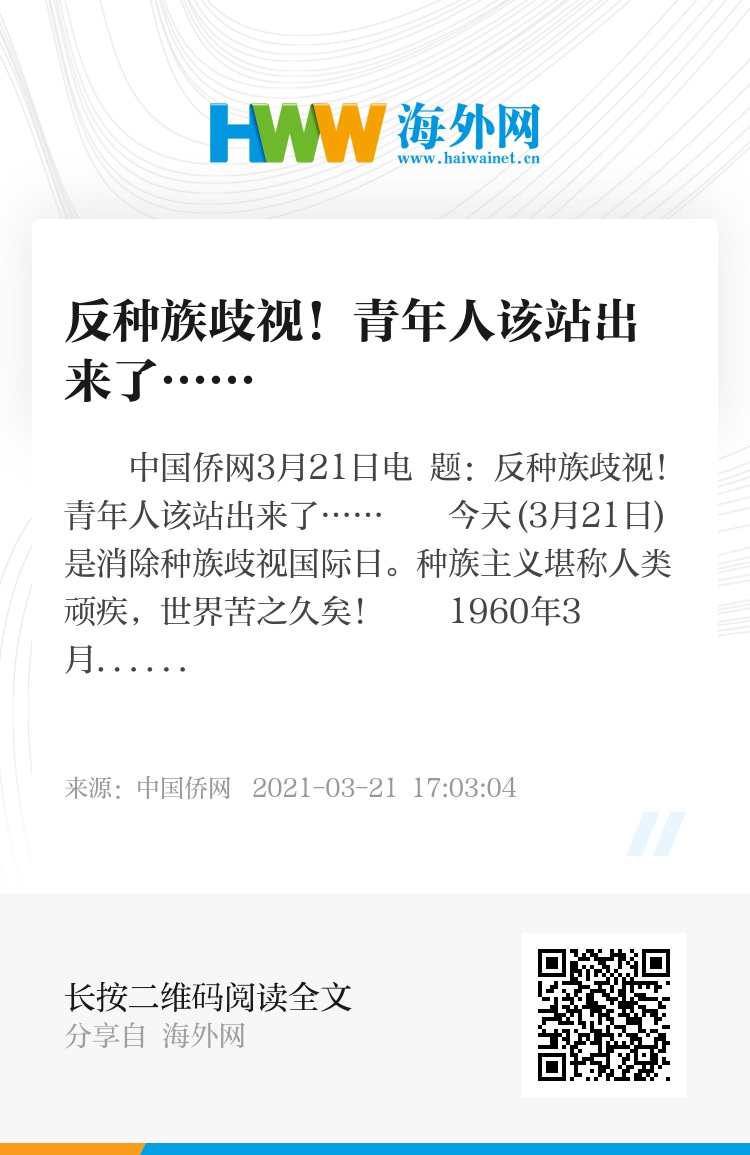 中国侨网3月21日电 题:反种族歧视!青年人该站出来了……