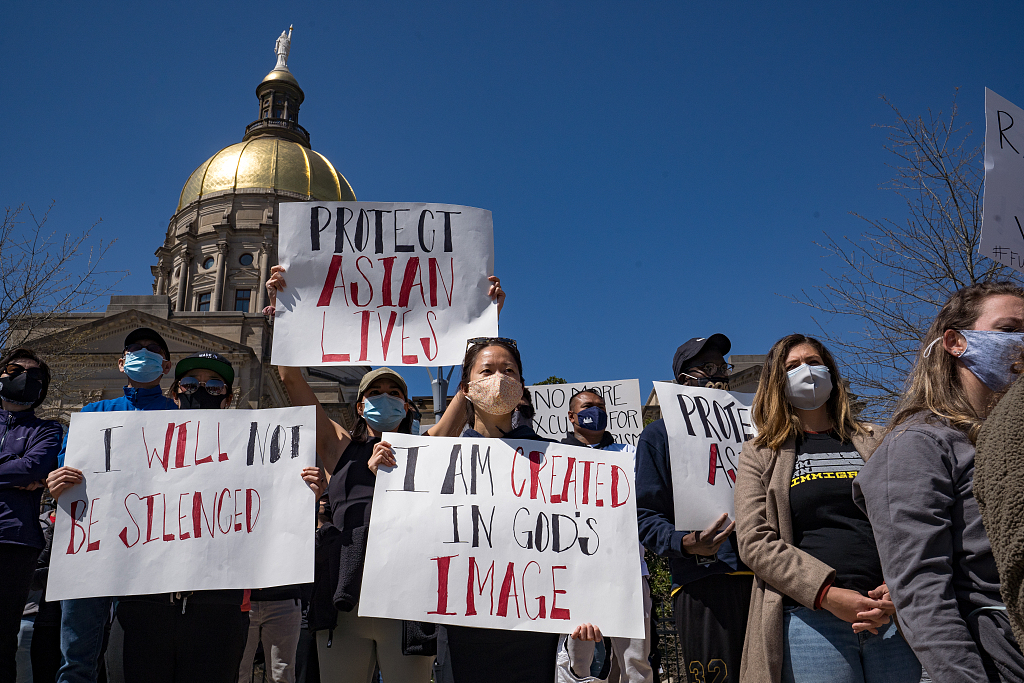 当地时间2021年3月20日,美国,包括亚特兰大在内的美国多地爆发主题为“停止仇恨亚裔”(Stop Asian Hate)的游行和集会,以此抗议亚特兰大按摩中心发生的枪击案以及近期在美国激增的针对亚裔的仇恨事件。图片来源:人民视觉