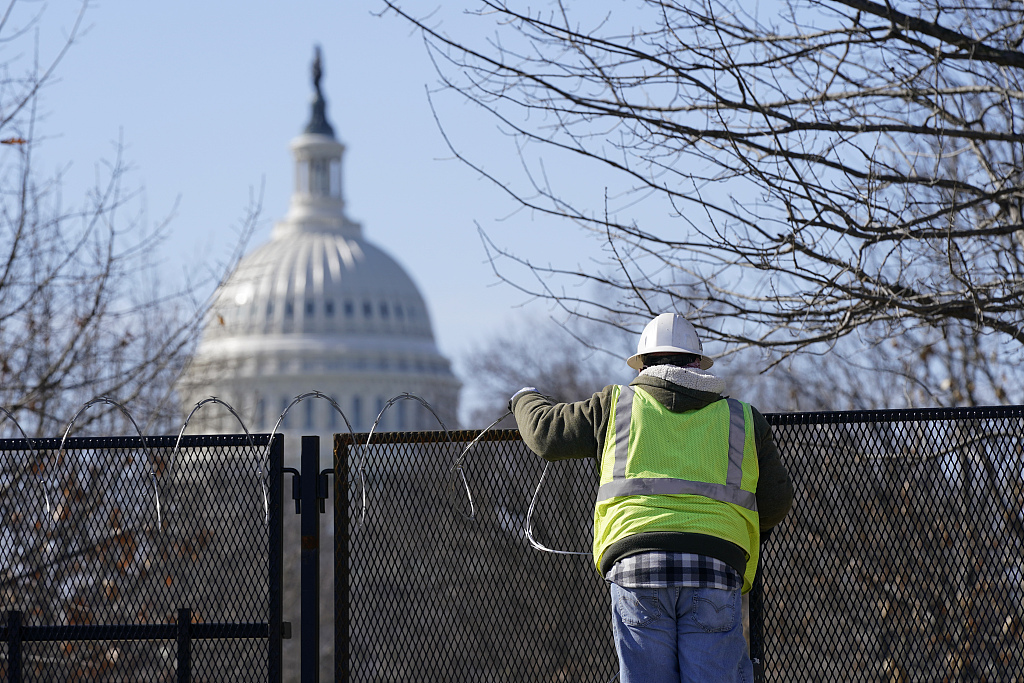 当地时间2021年3月20日,美国华盛顿特区,工人拆除国会大厦外设置的栅栏。图片来源:人民视觉