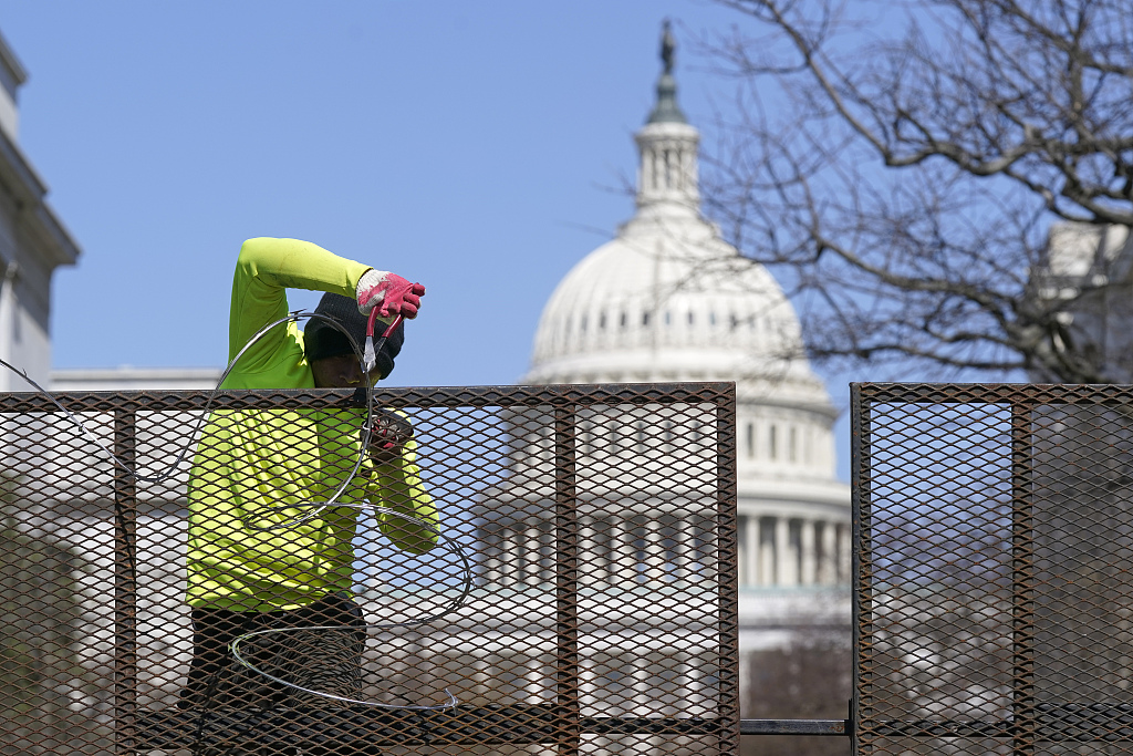 当地时间2021年3月20日,美国华盛顿特区,工人拆除国会大厦外设置的栅栏。图片来源:人民视觉