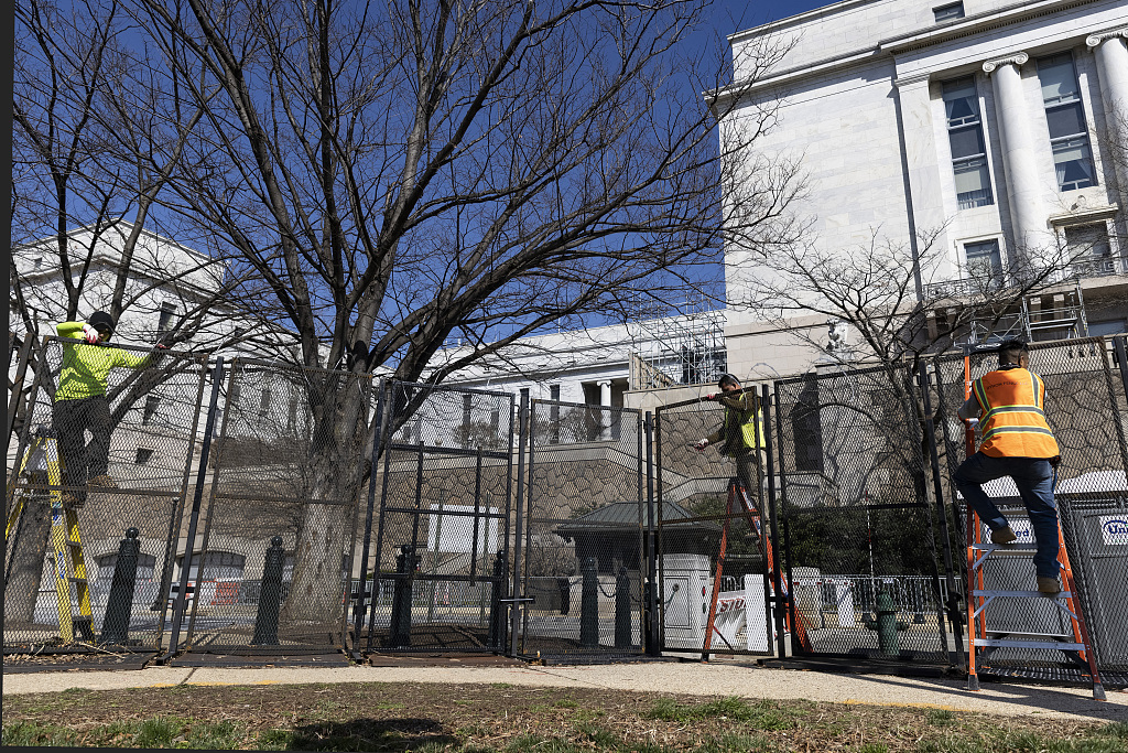 当地时间2021年3月20日,美国华盛顿特区,美国国会大厦外栅栏被拆除。此前,有政界人士批评国会大厦安全措施过度。随后,美国国会警察计划减少国会大厦周围的栅栏,并考虑缩减在该处的国民警卫队。图片来源:人民视觉