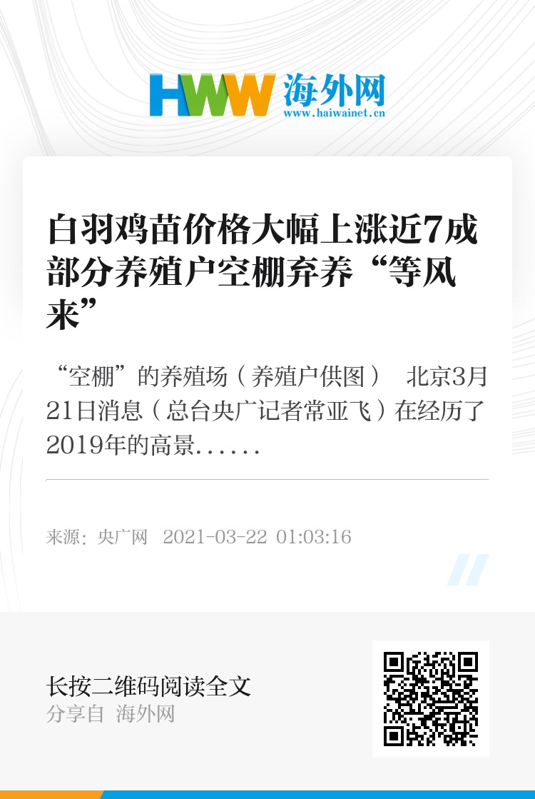 央广网北京3月21日消息(总台央广记者常亚飞)在经历了2019年的高景气后,2020年疫情导致的需求萎缩让养鸡行业跌落谷底。随着疫情逐步被控制,被抑制的消费需求开始释放,肉鸡行业景气度也在回升,这对养殖户来说本应是一个好消息,但是记者采访发现,一些地方的白羽鸡养殖场却出现了“空棚弃养”的情况,这是怎么回事儿?对鸡肉价格又会有何影响?