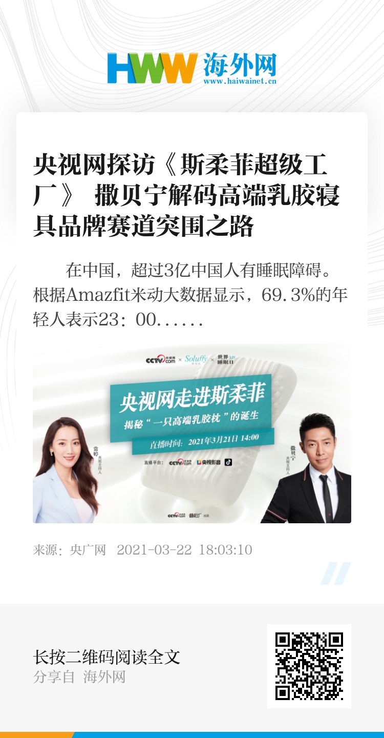 2021年3月21日,国际睡眠日,斯柔菲携手央视主持人撒贝宁,常婷,深度探访“深睡革命超级工厂”斯柔菲,带着对于“深睡”的疑问及乳胶核心科技十分好奇,央视网在线直播解码斯柔菲在乳胶寝具高端专业赛道的品牌突围之路,撒老师与斯柔菲一起关注健康睡眠。
