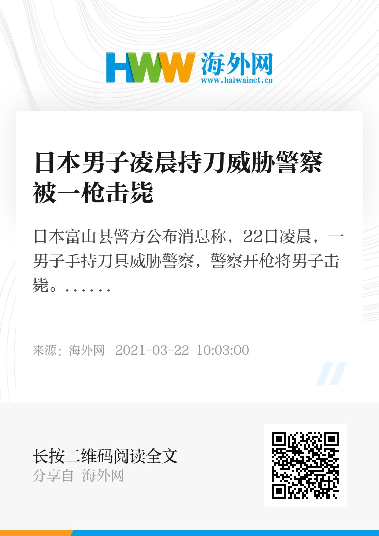 海外网3月22日电 综合日本共同社、朝日电视台消息,日本富山县警方公布消息称,22日凌晨,一男子手持刀具威胁警察,警察开枪将男子击毙。