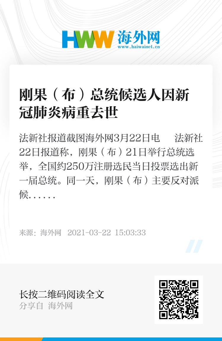 海外网3月22日电 法新社22日报道称,刚果(布)21日举行总统选举,全国约250万注册选民当日投票选出新一届总统。同一天,刚果(布)主要反对派候选人科莱拉斯因新冠肺炎病情加重,在送往法国治疗途中死亡。