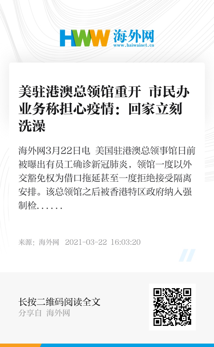 海外网3月22日电 美国驻港澳总领事馆日前被曝出有员工确诊新冠肺炎,领馆一度以外交豁免权为借口拖延甚至一度拒绝接受隔离安排。该总领馆之后被香港特区政府纳入强制检测范围,关闭多日以便消毒清洁。领馆方面已于22日正式重开并提供外事服务,但仍有前来办理业务的市民表达了担忧。