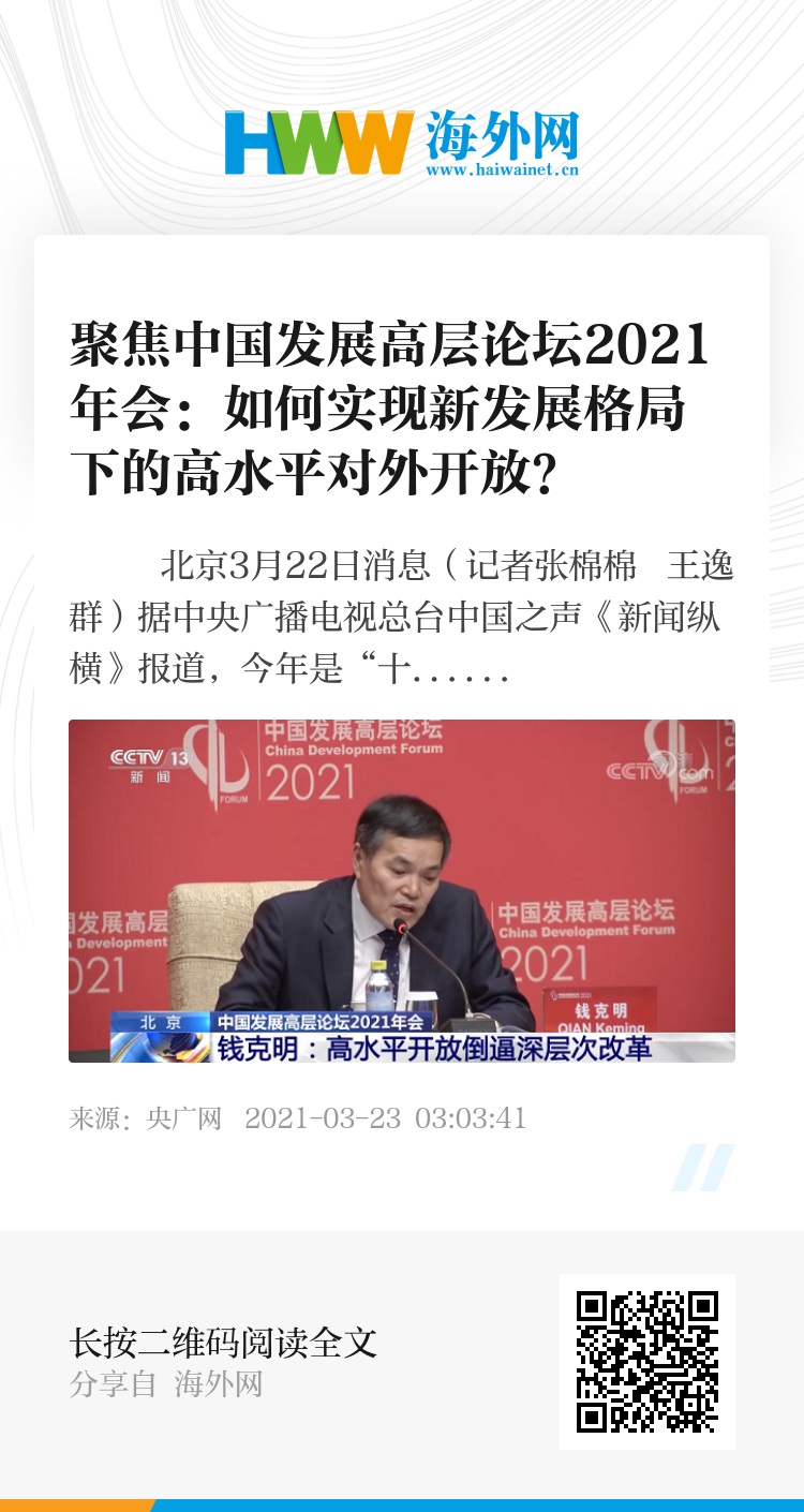 央广网北京3月22日消息(记者张棉棉 王逸群)据中央广播电视总台中国之声《新闻纵横》报道,今年是“十四五”开局之年,如何更好地迈上现代化新征程,实现新发展格局下的高水平对外开放一直是行业内外热议的话题。在21日举行的中国发展高层论坛2021年会上,来自海内外的政要、企业负责人也带来了他们的答案。
