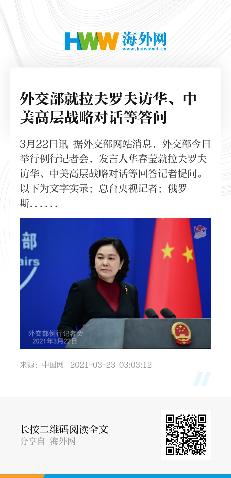 中国网3月22日讯 据外交部网站消息,外交部今日举行例行记者会,发言人华春莹就拉夫罗夫访华、中美高层战略对话等回答记者提问。以下为文字实录: