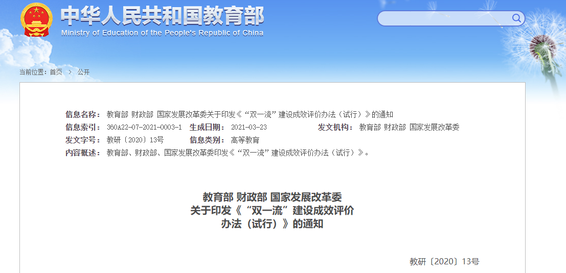 教育部 财政部 国家发展改革委关于印发《“双一流”建设成效评价办法(试行)》的通知