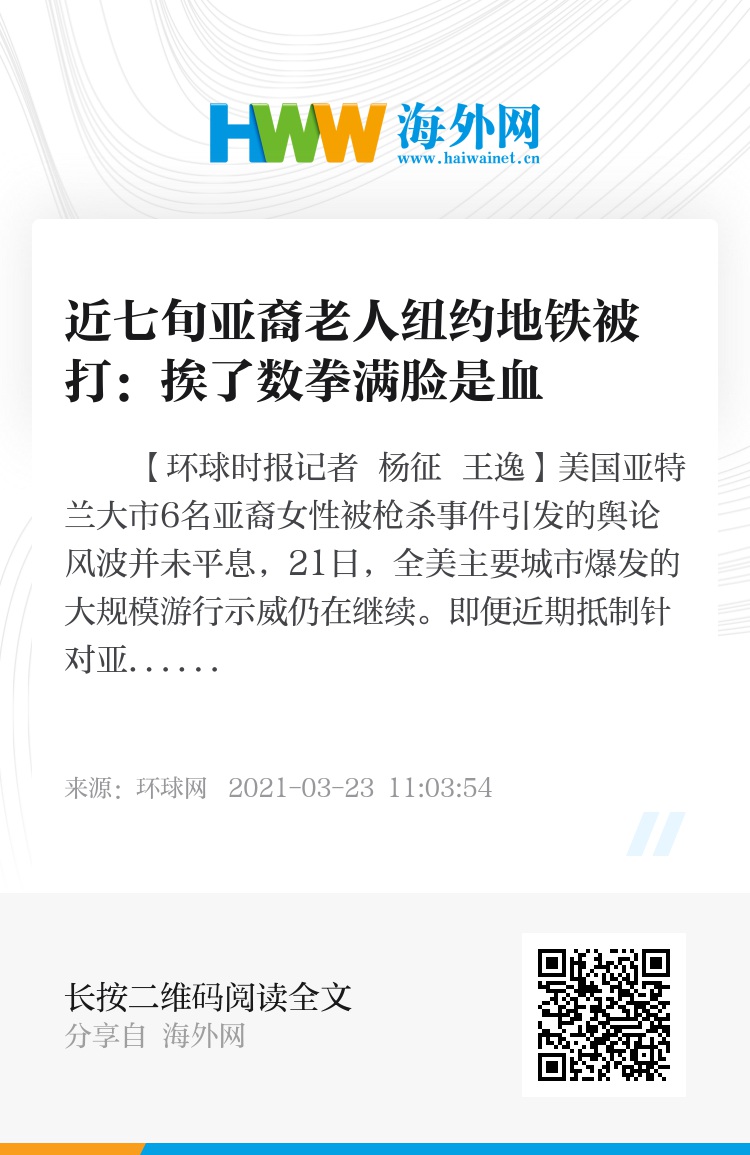【环球时报记者 杨征 王逸】美国亚特兰大市6名亚裔女性被枪杀事件引发的舆论风波并未平息,21日,全美主要城市爆发的大规模游行示威仍在继续。即便近期抵制针对亚裔歧视的呼声越来越强烈,依然无法杜绝此类事件的发生――上周,一名亚裔老人在纽约地铁被打、满脸是血的照片再次刺痛美国亚裔神经。据《纽约每日新闻》21日报道,当天纽约警方逮捕了36岁的黑人男子马蒂厄,他被指在纽约地铁上袭击了一名68岁的男性亚裔老人。美国全国广播公司21日称,警方未公布马蒂厄的作案动机,只是称目前没有证据证明这是一起种族歧视事件。