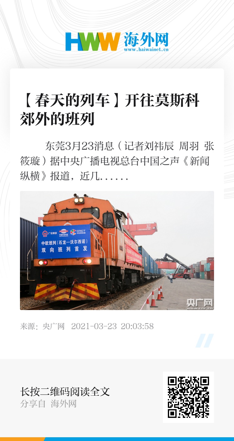 从广东东莞的石龙到莫斯科,全程12000多公里,是从广东石龙站出发的中欧班列中最遥远的一条线路。铁轨一头连接着制造业发达的中国南方热土,一头连接着物产丰富的俄罗斯腹地,双向班列就如同穿梭其间的红线,将两端连接得越发紧密。中国之声特别报道《春天的列车》,23日推出《开往莫斯科郊外的列车》。