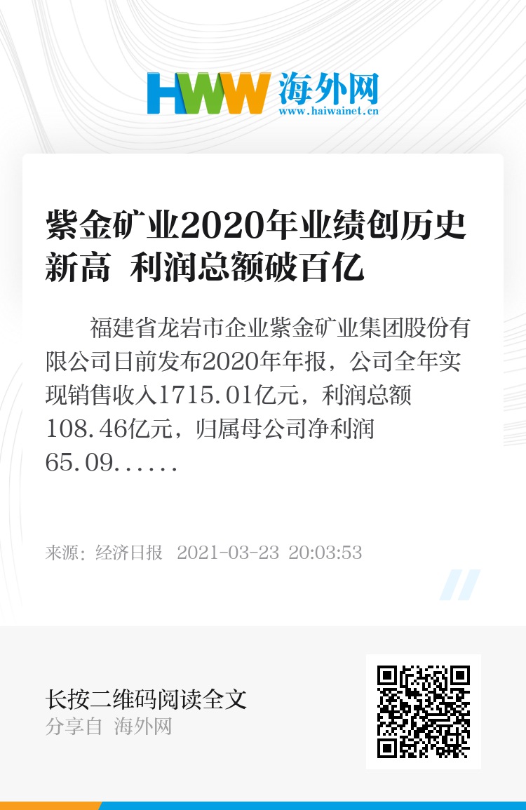 福建省龙岩市企业紫金矿业集团股份有限公司日前发布2020年年报,公司全年实现销售收入1715.01亿元,利润总额108.46亿元,归属母公司净利润65.09亿元,实现经营性净现金流142.68亿元,均创历史最好水平。