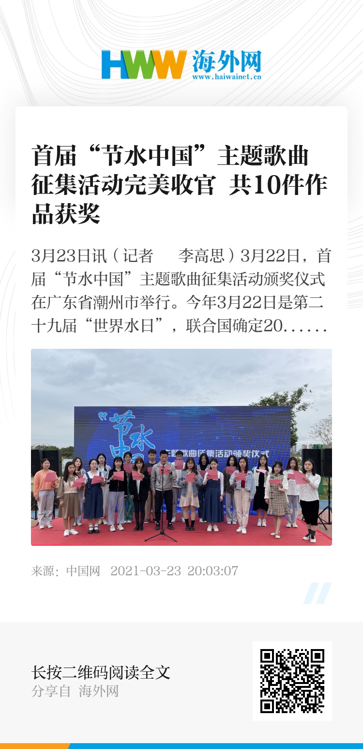 中国网3月23日讯(记者 李高思)3月22日,首届“节水中国”主题歌曲征集活动颁奖仪式在广东省潮州市举行。
