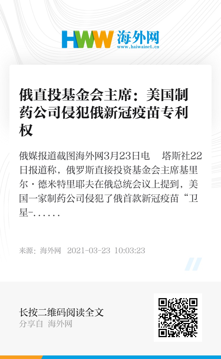 海外网3月23日电 塔斯社22日报道称,俄罗斯直接投资基金会主席基里尔·德米特里耶夫在俄总统会议上提到,美国一家制药公司侵犯了俄首款新冠疫苗“卫星-V”的专利权。德米特里耶夫称,俄方将严肃维护知识产权,并就此事向美方提出交涉。