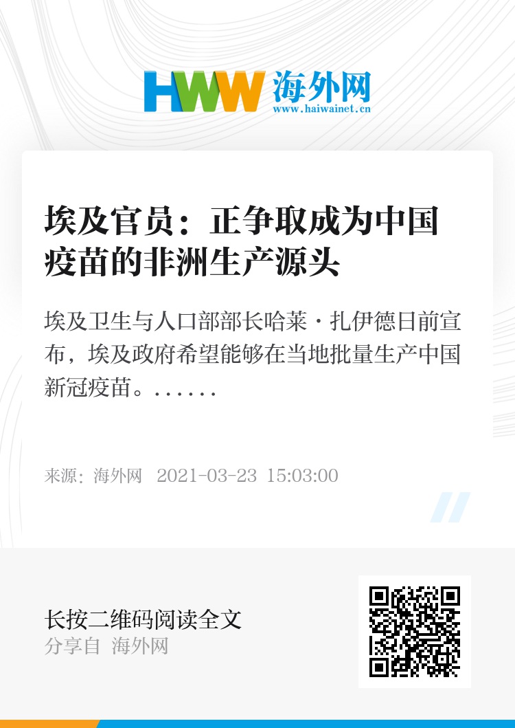 中国驻埃及大使馆公使肖军正此前表示,在批准紧急使用后,埃及政府正在推动中国疫苗的正常使用注册许可,埃方也表达了在本地生产中国疫苗的合作意愿。中方支持中国企业同埃及合作伙伴开展新冠疫苗研发和生产的全方位合作。(海外网 王珊宁)