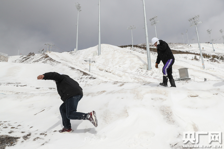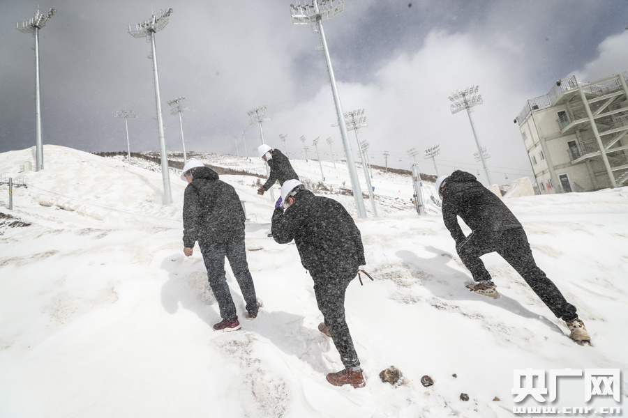 河北崇礼,吴雪松、邓仲泽、王山铭正在做雪道巡查工作(央广网记者韩靖 摄)