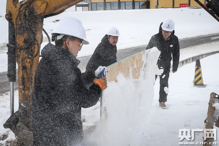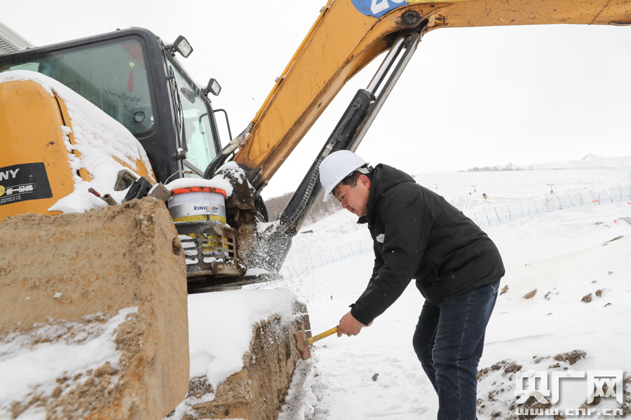 闫轩正在重新启动挖掘机,清理雪道周边的冻层(央广网记者韩靖 摄)