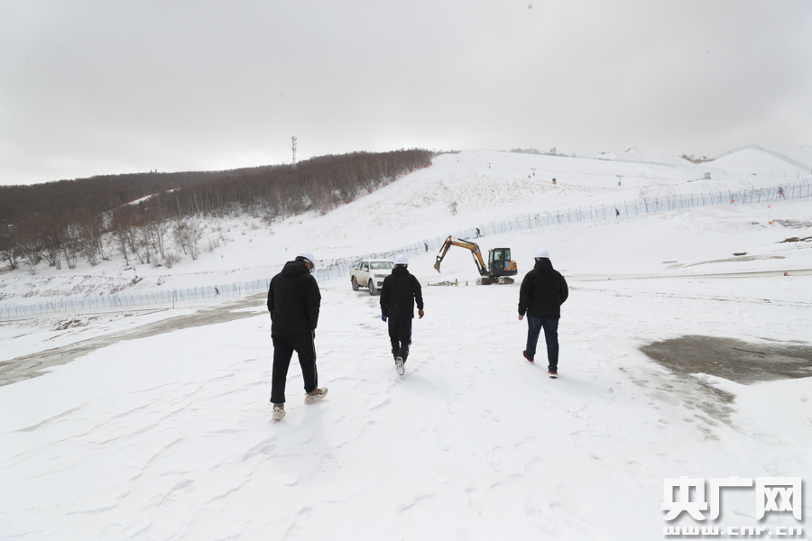 河北崇礼,吴雪松和工友正在巡查雪场的路上(央广网记者韩靖 摄)