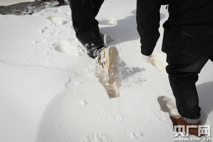 在雪中巡查容易摔倒,工人们尽量保持平衡(央广网记者韩靖 摄)