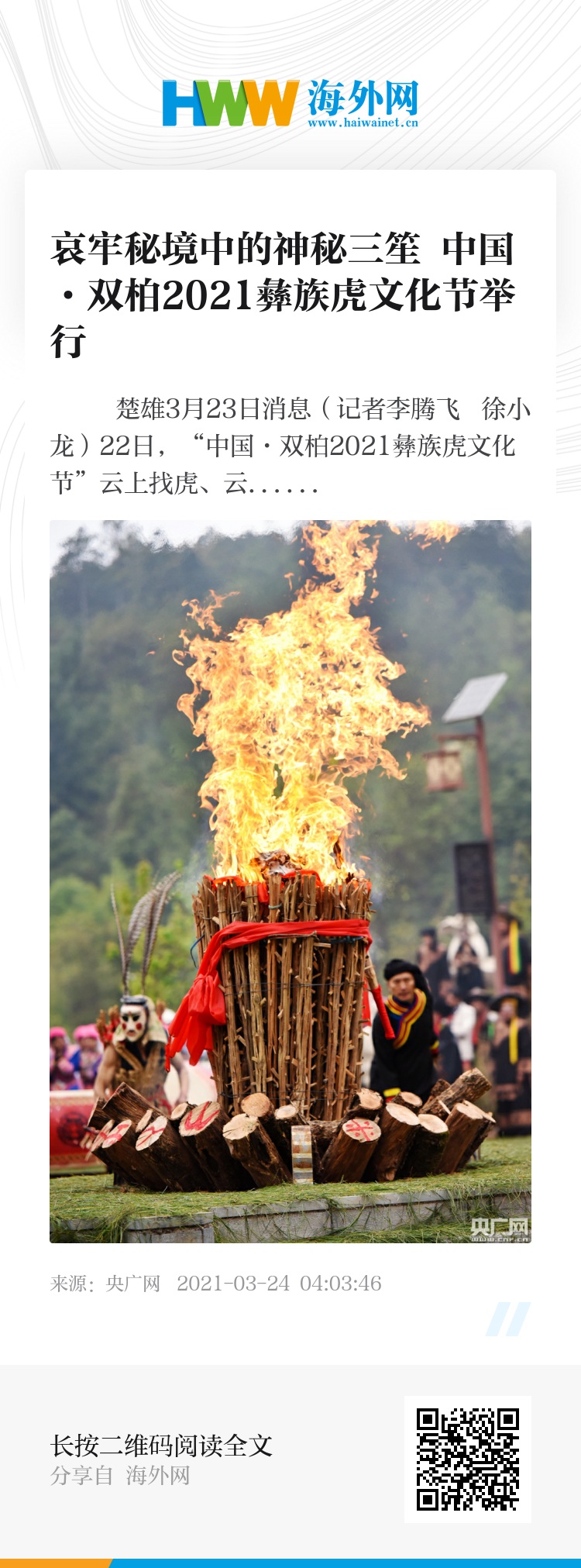 央广网楚雄3月23日消息(记者李腾飞 徐小龙)22日,“中国·双柏2021彝族虎文化节”云上找虎、云上看虎、云上旅游系列活动之一——云上看虎“老虎笙”展演在云南省楚雄彝族自治州双柏县李方村举行。