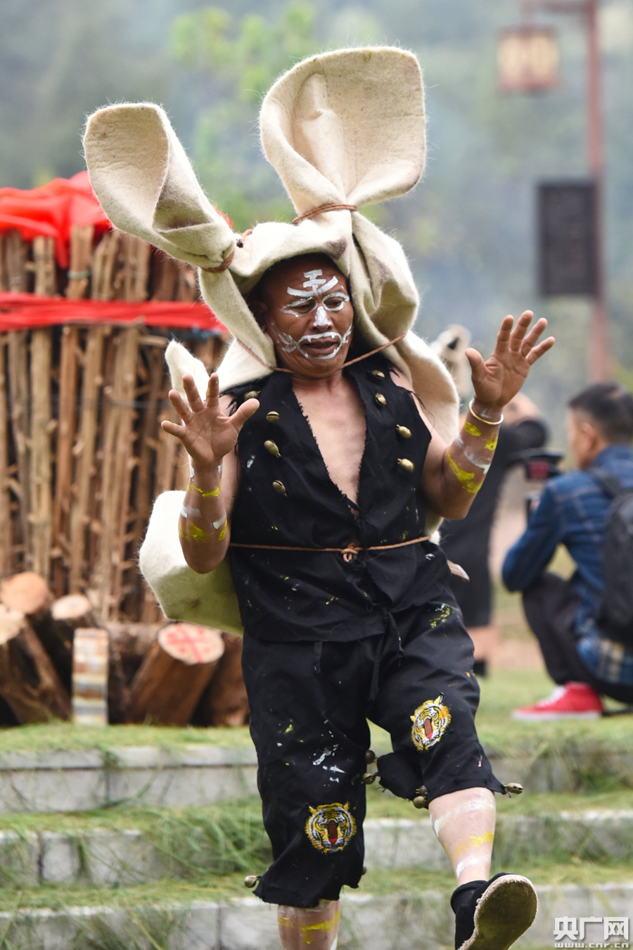欢乐的《花彝鼓》鼓点后,彝族人民心目中德高望重的族群智者“毕摩”登场了。在漫长的历史长河里,“毕摩”用古老而又传统的方式不断传承着彝族的语言文字,规范着彝族的社会伦理,弘扬着彝族文化。“虎文化”的盛典上,当然少不了来自他们的祈福。